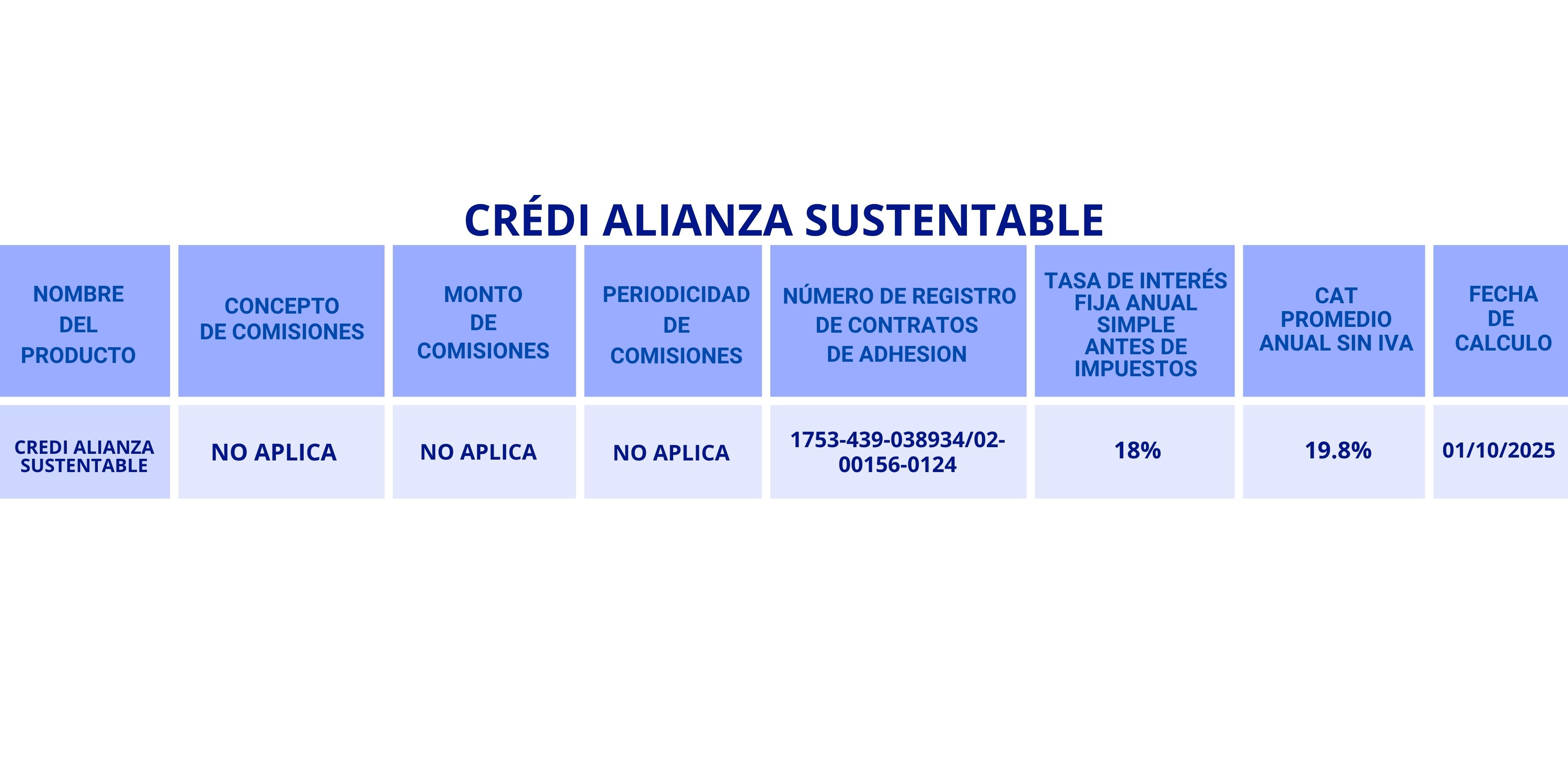 Crédi-Alianza Sustentable, es un crédito que fomenta el óptimo aprovechamiento del agua, mediante la utilización de muebles y/o equipos que permitan el ahorro, almacenaje y reutilización, generando conciencia social en el cuidado del ambiente, así como su mantenimiento regular.